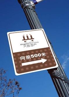 興越地產的戶外指示牌設計慣有獨特的思維模式,logo在實際生活中,充分融入了自由法藝術設計風格,為大眾創新設計更多富有個性、時尚、易懂的引導標識牌。